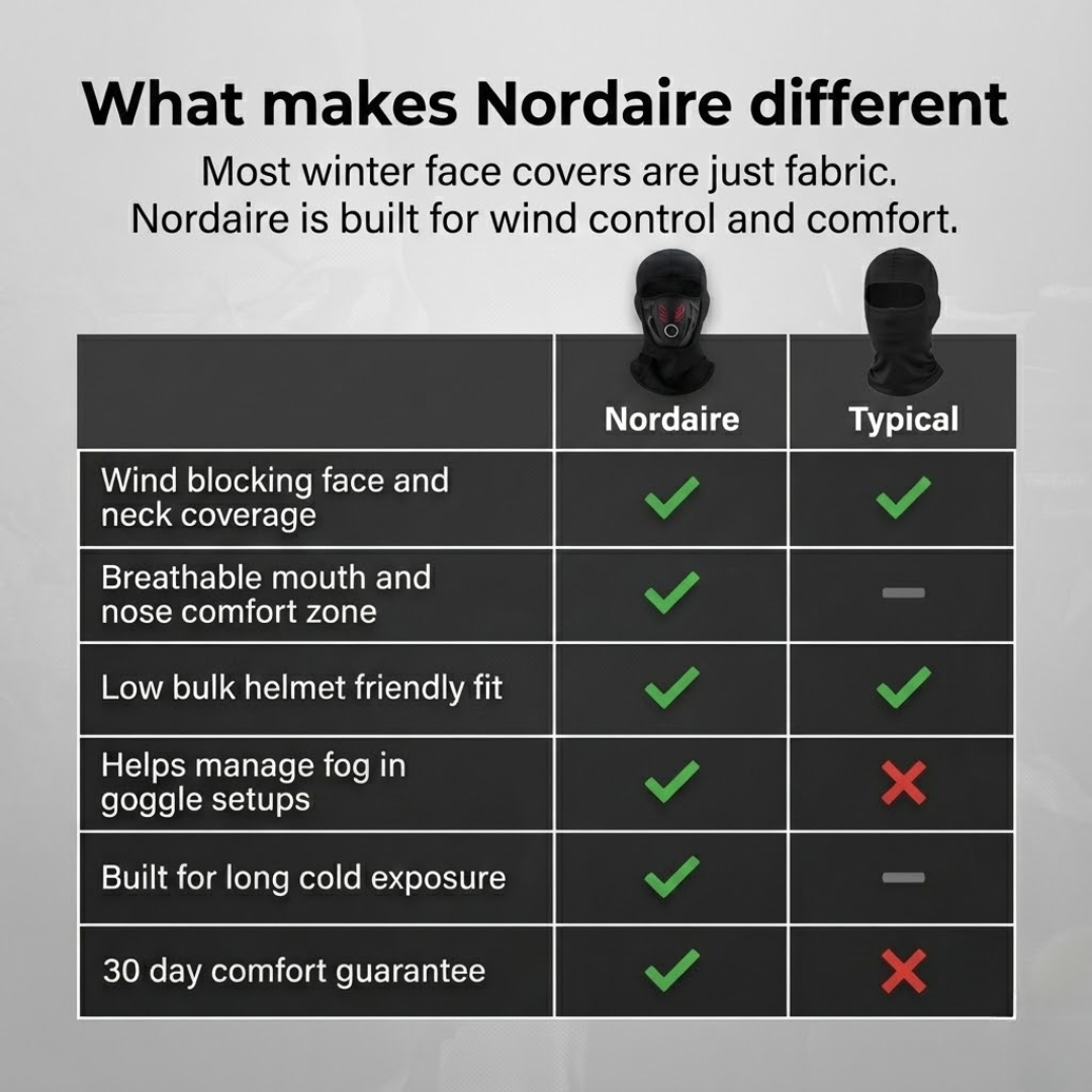 A common misconception is thinking all winter balaclavas feel the same. Most are just fabric that gets wet, shifts around, or forces your breath straight upward.Nordaire is built around wind control, breathing comfort, and real world winter use so you can stay warm without fighting your gear.